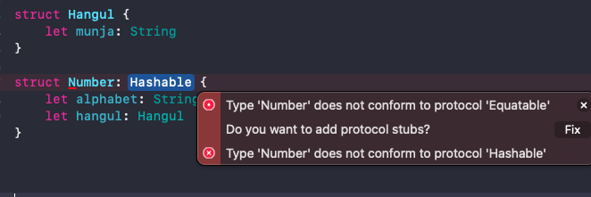 하지만 사실 이건 똑똑한 Swift가 Number의 프로퍼티가 모두 Hashable하단 것을 알아서 문제가 생기지 않은 겁니다.