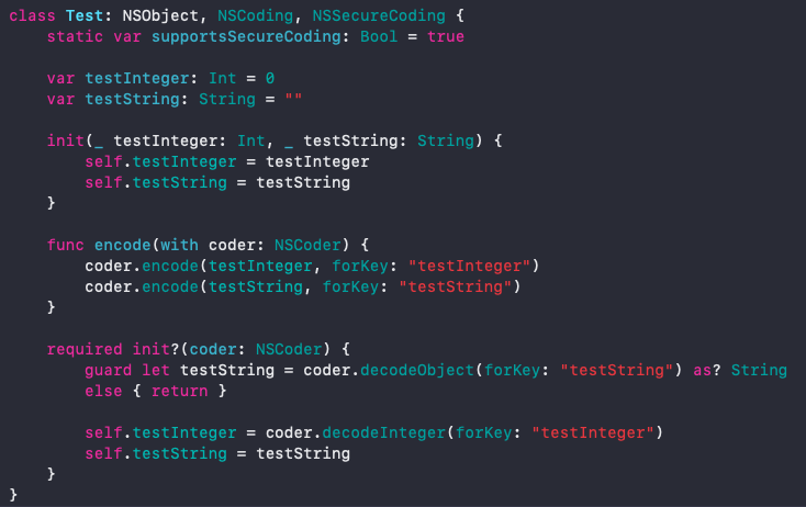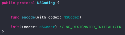 encode(with coder: NSCoder)와 init?(coder: NSCoder)만 구현하면 됩니다.