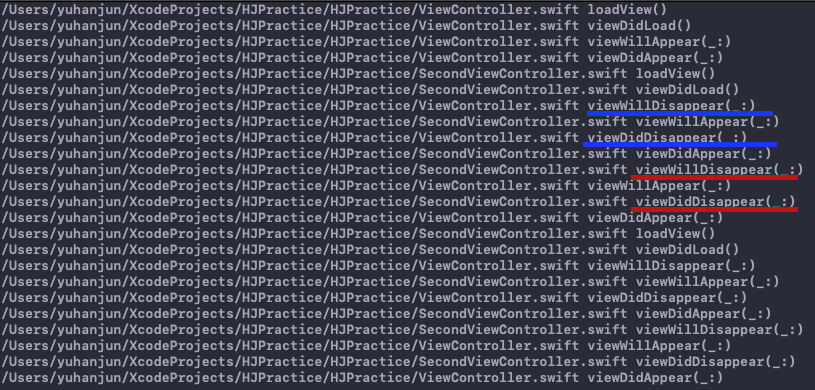willDisappear 다음에 didDisappear가 실행되는 것을 확인할 수 있습니다.