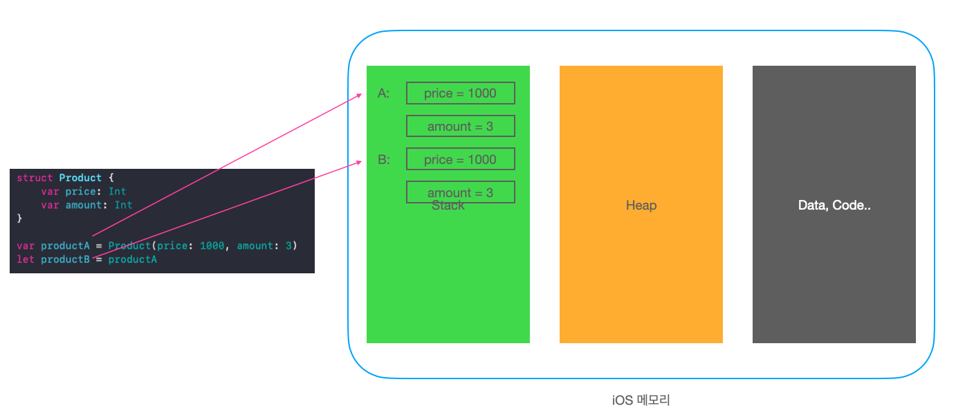 구조체는 참조타입이 아닌 값 타입이랍니다!