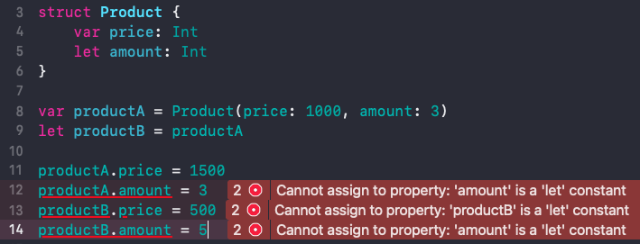 하지만 Struct의 경우에는 let으로 선언하면 내부 프로퍼티의 값이 var로 선언되어 있어도 값 변경이 불가능합니다.